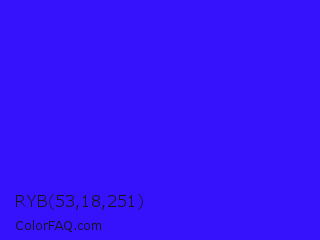 RYB 53,18,251 Color is a normal indigo color and the nearest color is Electric Ultramarine #3f00ff. Hex code #3512fb and RGB value is rgb(53,18,251). In RGB color space, this color is composed of 21% red, 7% green, 98% blue, In CMYK color space, this color is composed of 79% cyan, 93% magenta, 0% yellow , 2% black , In HSL color space, this color has a hue angle of 249° , 97% saturation and 53% lightness.