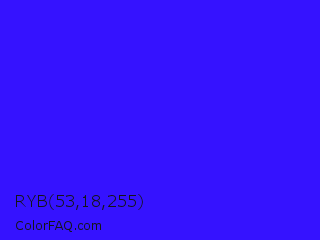 RYB 53,18,255 Color is a normal indigo color and the nearest color is Electric Ultramarine #3f00ff. Hex code #3512ff and RGB value is rgb(53,18,255). In RGB color space, this color is composed of 21% red, 7% green, 100% blue, In CMYK color space, this color is composed of 79% cyan, 93% magenta, 0% yellow , 0% black , In HSL color space, this color has a hue angle of 249° , 100% saturation and 54% lightness.