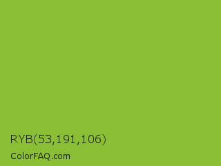 RYB 53,191,106 Color is a normal green color and the nearest color is Sushi #87ab39. Hex code #8abf35 and RGB value is rgb(138,191,53). In RGB color space, this color is composed of 54% red, 75% green, 21% blue, In CMYK color space, this color is composed of 28% cyan, 0% magenta, 72% yellow , 25% black , In HSL color space, this color has a hue angle of 83° , 57% saturation and 48% lightness.