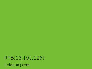 RYB 53,191,126 Color is a normal green color and the nearest color is Green RYB #66b032. Hex code #76bf35 and RGB value is rgb(118,191,53). In RGB color space, this color is composed of 46% red, 75% green, 21% blue, In CMYK color space, this color is composed of 38% cyan, 0% magenta, 72% yellow , 25% black , In HSL color space, this color has a hue angle of 92° , 57% saturation and 48% lightness.