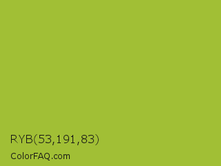 RYB 53,191,83 Color is a normal lime color and the nearest color is Android Green #a4c639. Hex code #a1bf35 and RGB value is rgb(161,191,53). In RGB color space, this color is composed of 63% red, 75% green, 21% blue, In CMYK color space, this color is composed of 16% cyan, 0% magenta, 72% yellow , 25% black , In HSL color space, this color has a hue angle of 73° , 57% saturation and 48% lightness.
