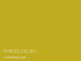 RYB 53,192,31 Color is a normal yellow color and the nearest color is Hokey Pokey #c8a528. Hex code #c0ad1f and RGB value is rgb(192,173,31). In RGB color space, this color is composed of 75% red, 68% green, 12% blue, In CMYK color space, this color is composed of 0% cyan, 10% magenta, 84% yellow , 25% black , In HSL color space, this color has a hue angle of 53° , 72% saturation and 44% lightness.