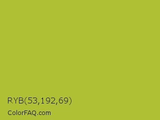 RYB 53,192,69 Color is a normal yellow color and the nearest color is Android Green #a4c639. Hex code #b0c035 and RGB value is rgb(176,192,53). In RGB color space, this color is composed of 69% red, 75% green, 21% blue, In CMYK color space, this color is composed of 8% cyan, 0% magenta, 72% yellow , 25% black , In HSL color space, this color has a hue angle of 67° , 57% saturation and 48% lightness.
