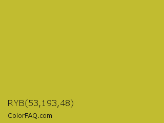 RYB 53,193,48 Color is a normal yellow color and the nearest color is Earls Green #c9b93b. Hex code #c1bc30 and RGB value is rgb(193,188,48). In RGB color space, this color is composed of 76% red, 74% green, 19% blue, In CMYK color space, this color is composed of 0% cyan, 3% magenta, 75% yellow , 24% black , In HSL color space, this color has a hue angle of 58° , 60% saturation and 47% lightness.