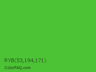 RYB 53,194,171 Color is a normal green color and the nearest color is Apple #4fa83d. Hex code #4cc235 and RGB value is rgb(76,194,53). In RGB color space, this color is composed of 30% red, 76% green, 21% blue, In CMYK color space, this color is composed of 61% cyan, 0% magenta, 73% yellow , 24% black , In HSL color space, this color has a hue angle of 110° , 57% saturation and 48% lightness.