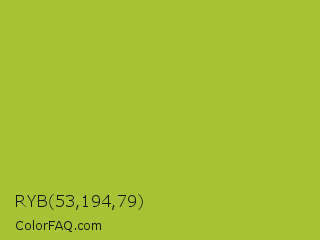 RYB 53,194,79 Color is a normal lime color and the nearest color is Android Green #a4c639. Hex code #a8c235 and RGB value is rgb(168,194,53). In RGB color space, this color is composed of 66% red, 76% green, 21% blue, In CMYK color space, this color is composed of 13% cyan, 0% magenta, 73% yellow , 24% black , In HSL color space, this color has a hue angle of 71° , 57% saturation and 48% lightness.