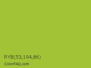 RYB 53,194,86 Color is a normal lime color and the nearest color is Android Green #a4c639. Hex code #a1c235 and RGB value is rgb(161,194,53). In RGB color space, this color is composed of 63% red, 76% green, 21% blue, In CMYK color space, this color is composed of 17% cyan, 0% magenta, 73% yellow , 24% black , In HSL color space, this color has a hue angle of 74° , 57% saturation and 48% lightness.