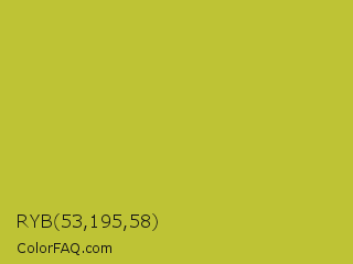 RYB 53,195,58 Color is a normal yellow color and the nearest color is Earls Green #c9b93b. Hex code #bec335 and RGB value is rgb(190,195,53). In RGB color space, this color is composed of 75% red, 76% green, 21% blue, In CMYK color space, this color is composed of 3% cyan, 0% magenta, 73% yellow , 24% black , In HSL color space, this color has a hue angle of 62° , 57% saturation and 49% lightness.
