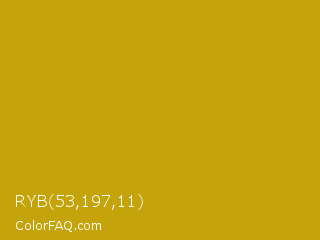 RYB 53,197,11 Color is a normal yellow color and the nearest color is Buddha Gold #c1a004. Hex code #c5a30b and RGB value is rgb(197,163,11). In RGB color space, this color is composed of 77% red, 64% green, 4% blue, In CMYK color space, this color is composed of 0% cyan, 17% magenta, 94% yellow , 23% black , In HSL color space, this color has a hue angle of 49° , 89% saturation and 41% lightness.