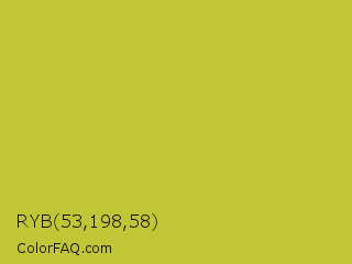 RYB 53,198,58 Color is a normal yellow color and the nearest color is Earls Green #c9b93b. Hex code #c1c635 and RGB value is rgb(193,198,53). In RGB color space, this color is composed of 76% red, 78% green, 21% blue, In CMYK color space, this color is composed of 3% cyan, 0% magenta, 73% yellow , 22% black , In HSL color space, this color has a hue angle of 62° , 58% saturation and 49% lightness.