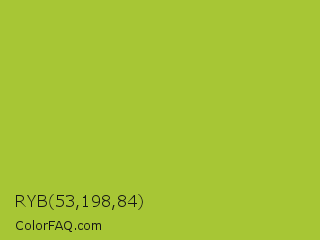 RYB 53,198,84 Color is a normal lime color and the nearest color is Android Green #a4c639. Hex code #a7c635 and RGB value is rgb(167,198,53). In RGB color space, this color is composed of 65% red, 78% green, 21% blue, In CMYK color space, this color is composed of 16% cyan, 0% magenta, 73% yellow , 22% black , In HSL color space, this color has a hue angle of 73° , 58% saturation and 49% lightness.