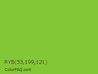 RYB 53,199,121 Color is a normal green color and the nearest color is Atlantis #97cd2d. Hex code #83c735 and RGB value is rgb(131,199,53). In RGB color space, this color is composed of 51% red, 78% green, 21% blue, In CMYK color space, this color is composed of 34% cyan, 0% magenta, 73% yellow , 22% black , In HSL color space, this color has a hue angle of 88° , 58% saturation and 49% lightness.