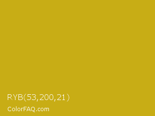 RYB 53,200,21 Color is a normal yellow color and the nearest color is Lemon Curry #cca01d. Hex code #c8ad15 and RGB value is rgb(200,173,21). In RGB color space, this color is composed of 78% red, 68% green, 8% blue, In CMYK color space, this color is composed of 0% cyan, 14% magenta, 90% yellow , 22% black , In HSL color space, this color has a hue angle of 51° , 81% saturation and 43% lightness.