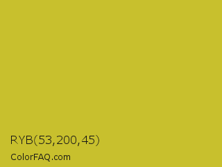 RYB 53,200,45 Color is a normal yellow color and the nearest color is Earls Green #c9b93b. Hex code #c8c02d and RGB value is rgb(200,192,45). In RGB color space, this color is composed of 78% red, 75% green, 18% blue, In CMYK color space, this color is composed of 0% cyan, 4% magenta, 78% yellow , 22% black , In HSL color space, this color has a hue angle of 57° , 63% saturation and 48% lightness.