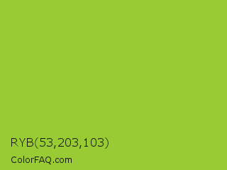 RYB 53,203,103 Color is a normal green color and the nearest color is Yellow Green #9acd32. Hex code #99cb35 and RGB value is rgb(153,203,53). In RGB color space, this color is composed of 60% red, 80% green, 21% blue, In CMYK color space, this color is composed of 25% cyan, 0% magenta, 74% yellow , 20% black , In HSL color space, this color has a hue angle of 80° , 59% saturation and 50% lightness.