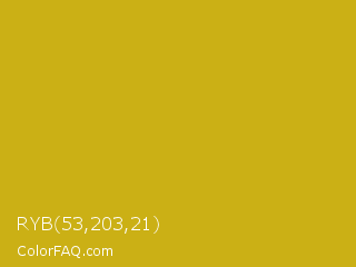 RYB 53,203,21 Color is a normal yellow color and the nearest color is Lemon Curry #cca01d. Hex code #cbb015 and RGB value is rgb(203,176,21). In RGB color space, this color is composed of 80% red, 69% green, 8% blue, In CMYK color space, this color is composed of 0% cyan, 13% magenta, 90% yellow , 20% black , In HSL color space, this color has a hue angle of 51° , 81% saturation and 44% lightness.