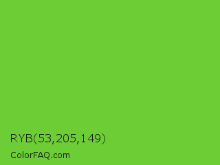 RYB 53,205,149 Color is a normal green color and the nearest color is Green RYB #66b032. Hex code #6dcd35 and RGB value is rgb(109,205,53). In RGB color space, this color is composed of 43% red, 80% green, 21% blue, In CMYK color space, this color is composed of 47% cyan, 0% magenta, 74% yellow , 20% black , In HSL color space, this color has a hue angle of 98° , 60% saturation and 51% lightness.