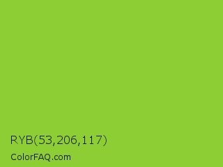 RYB 53,206,117 Color is a normal green color and the nearest color is Atlantis #97cd2d. Hex code #8ece35 and RGB value is rgb(142,206,53). In RGB color space, this color is composed of 56% red, 81% green, 21% blue, In CMYK color space, this color is composed of 31% cyan, 0% magenta, 74% yellow , 19% black , In HSL color space, this color has a hue angle of 85° , 61% saturation and 51% lightness.