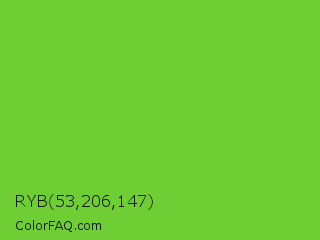 RYB 53,206,147 Color is a normal green color and the nearest color is Green RYB #66b032. Hex code #70ce35 and RGB value is rgb(112,206,53). In RGB color space, this color is composed of 44% red, 81% green, 21% blue, In CMYK color space, this color is composed of 46% cyan, 0% magenta, 74% yellow , 19% black , In HSL color space, this color has a hue angle of 97° , 61% saturation and 51% lightness.