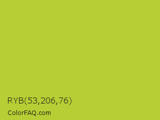 RYB 53,206,76 Color is a normal yellow color and the nearest color is Android Green #a4c639. Hex code #b7ce35 and RGB value is rgb(183,206,53). In RGB color space, this color is composed of 72% red, 81% green, 21% blue, In CMYK color space, this color is composed of 11% cyan, 0% magenta, 74% yellow , 19% black , In HSL color space, this color has a hue angle of 69° , 61% saturation and 51% lightness.