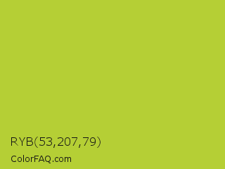 RYB 53,207,79 Color is a normal yellow color and the nearest color is Android Green #a4c639. Hex code #b5cf35 and RGB value is rgb(181,207,53). In RGB color space, this color is composed of 71% red, 81% green, 21% blue, In CMYK color space, this color is composed of 13% cyan, 0% magenta, 74% yellow , 19% black , In HSL color space, this color has a hue angle of 70° , 62% saturation and 51% lightness.