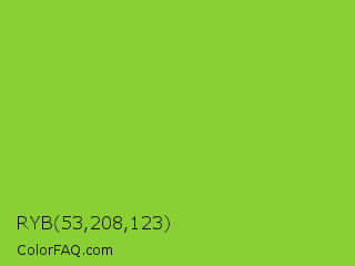 RYB 53,208,123 Color is a normal green color and the nearest color is Atlantis #97cd2d. Hex code #8ad035 and RGB value is rgb(138,208,53). In RGB color space, this color is composed of 54% red, 82% green, 21% blue, In CMYK color space, this color is composed of 34% cyan, 0% magenta, 75% yellow , 18% black , In HSL color space, this color has a hue angle of 87° , 62% saturation and 51% lightness.
