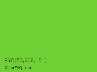 RYB 53,208,151 Color is a normal green color and the nearest color is Green RYB #66b032. Hex code #6ed035 and RGB value is rgb(110,208,53). In RGB color space, this color is composed of 43% red, 82% green, 21% blue, In CMYK color space, this color is composed of 47% cyan, 0% magenta, 75% yellow , 18% black , In HSL color space, this color has a hue angle of 98° , 62% saturation and 51% lightness.