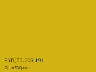 RYB 53,208,19 Color is a normal yellow color and the nearest color is Galliano #dcb20c. Hex code #d0b313 and RGB value is rgb(208,179,19). In RGB color space, this color is composed of 82% red, 70% green, 7% blue, In CMYK color space, this color is composed of 0% cyan, 14% magenta, 91% yellow , 18% black , In HSL color space, this color has a hue angle of 51° , 83% saturation and 45% lightness.