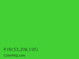 RYB 53,208,195 Color is a normal green color and the nearest color is Lime Green #32cd32. Hex code #42d035 and RGB value is rgb(66,208,53). In RGB color space, this color is composed of 26% red, 82% green, 21% blue, In CMYK color space, this color is composed of 68% cyan, 0% magenta, 75% yellow , 18% black , In HSL color space, this color has a hue angle of 115° , 62% saturation and 51% lightness.