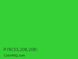 RYB 53,208,208 Color is a normal green color and the nearest color is Lime Green #32cd32. Hex code #35d035 and RGB value is rgb(53,208,53). In RGB color space, this color is composed of 21% red, 82% green, 21% blue, In CMYK color space, this color is composed of 75% cyan, 0% magenta, 75% yellow , 18% black , In HSL color space, this color has a hue angle of 120° , 62% saturation and 51% lightness.