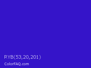 RYB 53,20,201 Color is a normal indigo color and the nearest color is Interdimensional Blue #360ccc. Hex code #3514c9 and RGB value is rgb(53,20,201). In RGB color space, this color is composed of 21% red, 8% green, 79% blue, In CMYK color space, this color is composed of 74% cyan, 90% magenta, 0% yellow , 21% black , In HSL color space, this color has a hue angle of 251° , 82% saturation and 43% lightness.