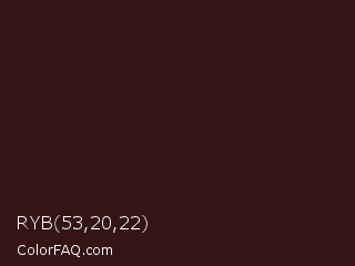 RYB 53,20,22 Color is a very dark red color and the nearest color is Tamarind #341515. Hex code #351416 and RGB value is rgb(53,20,22). In RGB color space, this color is composed of 21% red, 8% green, 9% blue, In CMYK color space, this color is composed of 0% cyan, 62% magenta, 58% yellow , 79% black , In HSL color space, this color has a hue angle of 356° , 45% saturation and 14% lightness.