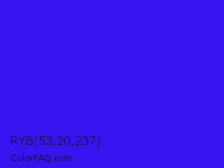 RYB 53,20,237 Color is a normal indigo color and the nearest color is Bluebonnet #1c1cf0. Hex code #3514ed and RGB value is rgb(53,20,237). In RGB color space, this color is composed of 21% red, 8% green, 93% blue, In CMYK color space, this color is composed of 78% cyan, 92% magenta, 0% yellow , 7% black , In HSL color space, this color has a hue angle of 249° , 86% saturation and 50% lightness.