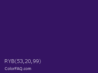 RYB 53,20,99 Color is a dark violet color and the nearest color is Jagger #350e57. Hex code #351463 and RGB value is rgb(53,20,99). In RGB color space, this color is composed of 21% red, 8% green, 39% blue, In CMYK color space, this color is composed of 46% cyan, 80% magenta, 0% yellow , 61% black , In HSL color space, this color has a hue angle of 265° , 66% saturation and 23% lightness.