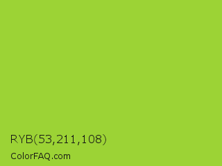 RYB 53,211,108 Color is a normal green color and the nearest color is Yellow Green #9acd32. Hex code #9cd335 and RGB value is rgb(156,211,53). In RGB color space, this color is composed of 61% red, 83% green, 21% blue, In CMYK color space, this color is composed of 26% cyan, 0% magenta, 75% yellow , 17% black , In HSL color space, this color has a hue angle of 81° , 64% saturation and 52% lightness.