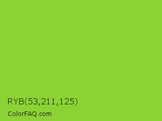 RYB 53,211,125 Color is a normal green color and the nearest color is Atlantis #97cd2d. Hex code #8bd335 and RGB value is rgb(139,211,53). In RGB color space, this color is composed of 55% red, 83% green, 21% blue, In CMYK color space, this color is composed of 34% cyan, 0% magenta, 75% yellow , 17% black , In HSL color space, this color has a hue angle of 87° , 64% saturation and 52% lightness.