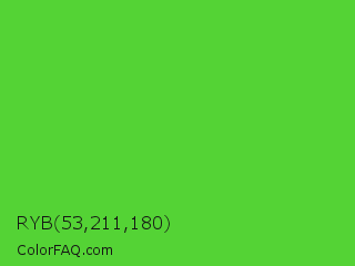 RYB 53,211,180 Color is a normal green color and the nearest color is Harlequin Green #46cb18. Hex code #54d335 and RGB value is rgb(84,211,53). In RGB color space, this color is composed of 33% red, 83% green, 21% blue, In CMYK color space, this color is composed of 60% cyan, 0% magenta, 75% yellow , 17% black , In HSL color space, this color has a hue angle of 108° , 64% saturation and 52% lightness.