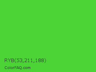 RYB 53,211,188 Color is a normal green color and the nearest color is Lime Green #32cd32. Hex code #4cd335 and RGB value is rgb(76,211,53). In RGB color space, this color is composed of 30% red, 83% green, 21% blue, In CMYK color space, this color is composed of 64% cyan, 0% magenta, 75% yellow , 17% black , In HSL color space, this color has a hue angle of 111° , 64% saturation and 52% lightness.