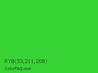 RYB 53,211,208 Color is a normal green color and the nearest color is Lime Green #32cd32. Hex code #38d335 and RGB value is rgb(56,211,53). In RGB color space, this color is composed of 22% red, 83% green, 21% blue, In CMYK color space, this color is composed of 73% cyan, 0% magenta, 75% yellow , 17% black , In HSL color space, this color has a hue angle of 119° , 64% saturation and 52% lightness.
