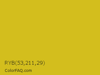 RYB 53,211,29 Color is a normal yellow color and the nearest color is Gold Tips #deba13. Hex code #d3be1d and RGB value is rgb(211,190,29). In RGB color space, this color is composed of 83% red, 75% green, 11% blue, In CMYK color space, this color is composed of 0% cyan, 10% magenta, 86% yellow , 17% black , In HSL color space, this color has a hue angle of 53° , 76% saturation and 47% lightness.