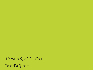 RYB 53,211,75 Color is a normal yellow color and the nearest color is Key Lime Pie #bfc921. Hex code #bdd335 and RGB value is rgb(189,211,53). In RGB color space, this color is composed of 74% red, 83% green, 21% blue, In CMYK color space, this color is composed of 10% cyan, 0% magenta, 75% yellow , 17% black , In HSL color space, this color has a hue angle of 68° , 64% saturation and 52% lightness.