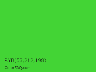 RYB 53,212,198 Color is a normal green color and the nearest color is Lime Green #32cd32. Hex code #43d435 and RGB value is rgb(67,212,53). In RGB color space, this color is composed of 26% red, 83% green, 21% blue, In CMYK color space, this color is composed of 68% cyan, 0% magenta, 75% yellow , 17% black , In HSL color space, this color has a hue angle of 115° , 65% saturation and 52% lightness.