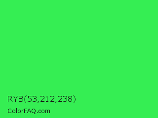 RYB 53,212,238 Color is a normal green color and the nearest color is UFO Green #3cd070. Hex code #35ee53 and RGB value is rgb(53,238,83). In RGB color space, this color is composed of 21% red, 93% green, 33% blue, In CMYK color space, this color is composed of 78% cyan, 0% magenta, 65% yellow , 7% black , In HSL color space, this color has a hue angle of 130° , 84% saturation and 57% lightness.