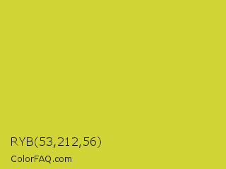 RYB 53,212,56 Color is a normal yellow color and the nearest color is Pear #d1e231. Hex code #d1d435 and RGB value is rgb(209,212,53). In RGB color space, this color is composed of 82% red, 83% green, 21% blue, In CMYK color space, this color is composed of 1% cyan, 0% magenta, 75% yellow , 17% black , In HSL color space, this color has a hue angle of 61° , 65% saturation and 52% lightness.