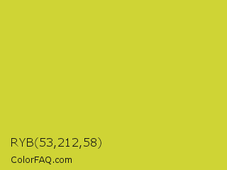 RYB 53,212,58 Color is a normal yellow color and the nearest color is Pear #d1e231. Hex code #cfd435 and RGB value is rgb(207,212,53). In RGB color space, this color is composed of 81% red, 83% green, 21% blue, In CMYK color space, this color is composed of 2% cyan, 0% magenta, 75% yellow , 17% black , In HSL color space, this color has a hue angle of 62° , 65% saturation and 52% lightness.