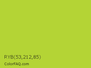 RYB 53,212,85 Color is a normal lime color and the nearest color is Android Green #a4c639. Hex code #b4d435 and RGB value is rgb(180,212,53). In RGB color space, this color is composed of 71% red, 83% green, 21% blue, In CMYK color space, this color is composed of 15% cyan, 0% magenta, 75% yellow , 17% black , In HSL color space, this color has a hue angle of 72° , 65% saturation and 52% lightness.