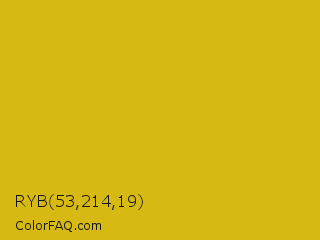 RYB 53,214,19 Color is a normal yellow color and the nearest color is Gold Tips #deba13. Hex code #d6b913 and RGB value is rgb(214,185,19). In RGB color space, this color is composed of 84% red, 73% green, 7% blue, In CMYK color space, this color is composed of 0% cyan, 14% magenta, 91% yellow , 16% black , In HSL color space, this color has a hue angle of 51° , 84% saturation and 46% lightness.