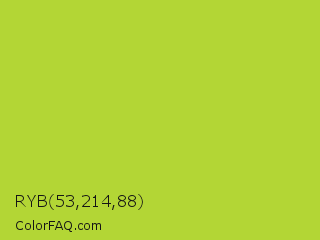 RYB 53,214,88 Color is a normal lime color and the nearest color is Android Green #a4c639. Hex code #b3d635 and RGB value is rgb(179,214,53). In RGB color space, this color is composed of 70% red, 84% green, 21% blue, In CMYK color space, this color is composed of 16% cyan, 0% magenta, 75% yellow , 16% black , In HSL color space, this color has a hue angle of 73° , 66% saturation and 52% lightness.