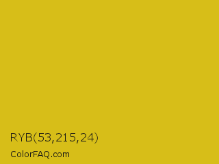 RYB 53,215,24 Color is a normal yellow color and the nearest color is Gold Tips #deba13. Hex code #d7be18 and RGB value is rgb(215,190,24). In RGB color space, this color is composed of 84% red, 75% green, 9% blue, In CMYK color space, this color is composed of 0% cyan, 12% magenta, 89% yellow , 16% black , In HSL color space, this color has a hue angle of 52° , 80% saturation and 47% lightness.