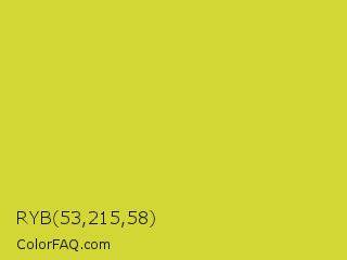 RYB 53,215,58 Color is a normal yellow color and the nearest color is Pear #d1e231. Hex code #d2d735 and RGB value is rgb(210,215,53). In RGB color space, this color is composed of 82% red, 84% green, 21% blue, In CMYK color space, this color is composed of 2% cyan, 0% magenta, 75% yellow , 16% black , In HSL color space, this color has a hue angle of 62° , 67% saturation and 53% lightness.